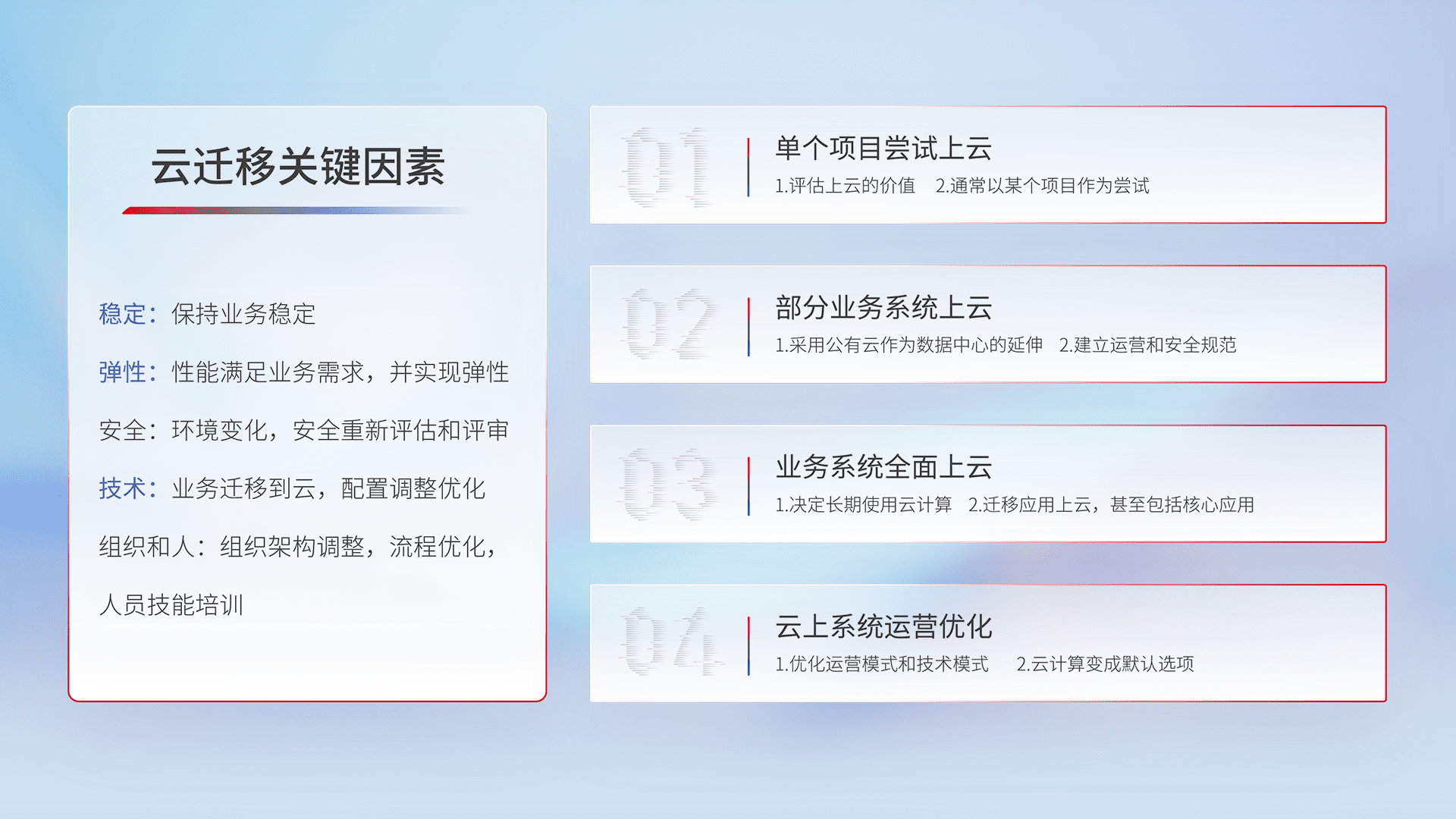 结合实际业务,,,,从规划设计、、、云平台选型、、云原生改造、、、数据迁移、、、、集成交付,,,迁移全过程为客户识别最佳上云路径,,做好风险识别管理,,,设计网络架构、、、、身份权限、、、、安全审计合规、、、、操作审计、、、日志审计、、、、监控告警策略、、多站点容灾设计等,,,对云上基础设施进行整体规划,,,提升IT治理水平,,,以满足弹性、、、高可用、、、高性能的需求。。