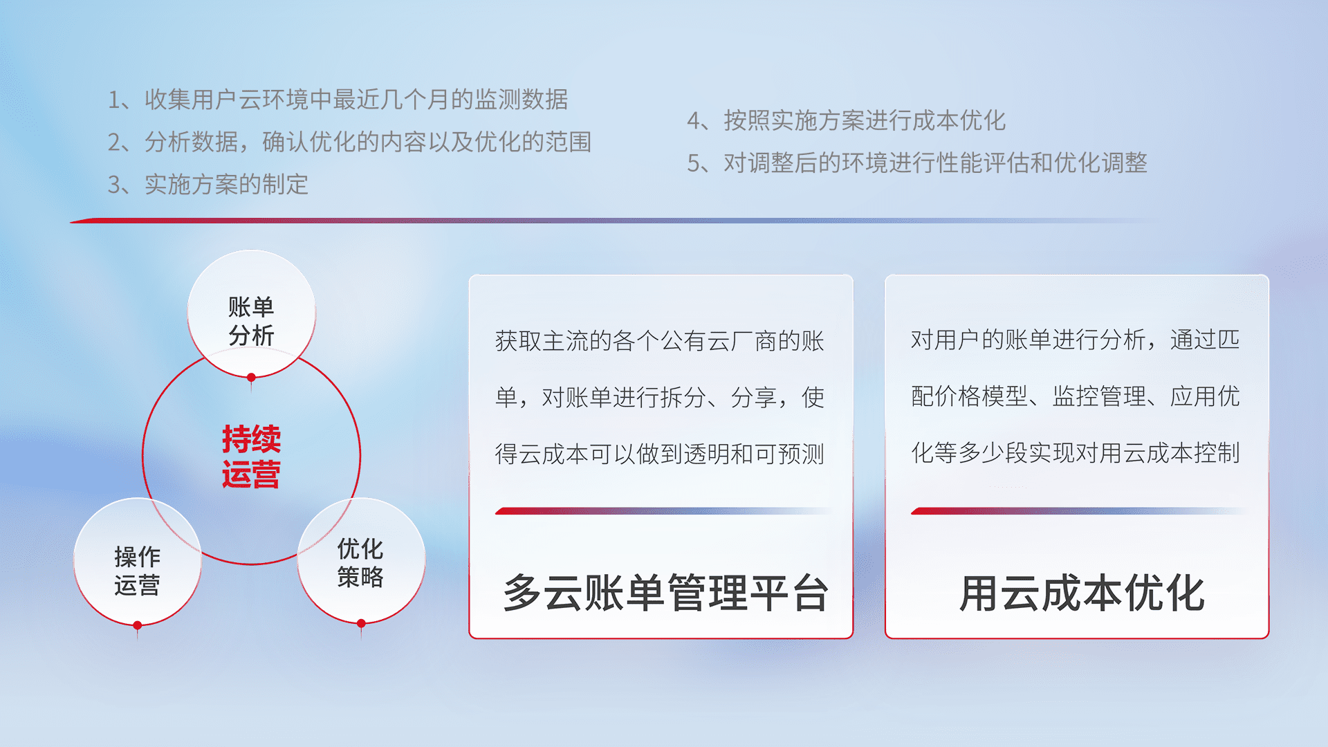 通过多云纳管,,,以统一的资源数据模型把客户的云资源进行抽象和封装,,进而实现对多云资源的统一操作,,,,保障云资源管理的可靠性、、稳定性与可用性。。。。量身定制化运维内容,,配置、、、开发运维、、补丁管理、、、、备份、、、监控、、、认证和访问管理、、、审计和日常巡检等,,,保障在用云过程中的可靠度,,,,稳定度以及高可用率。。。。